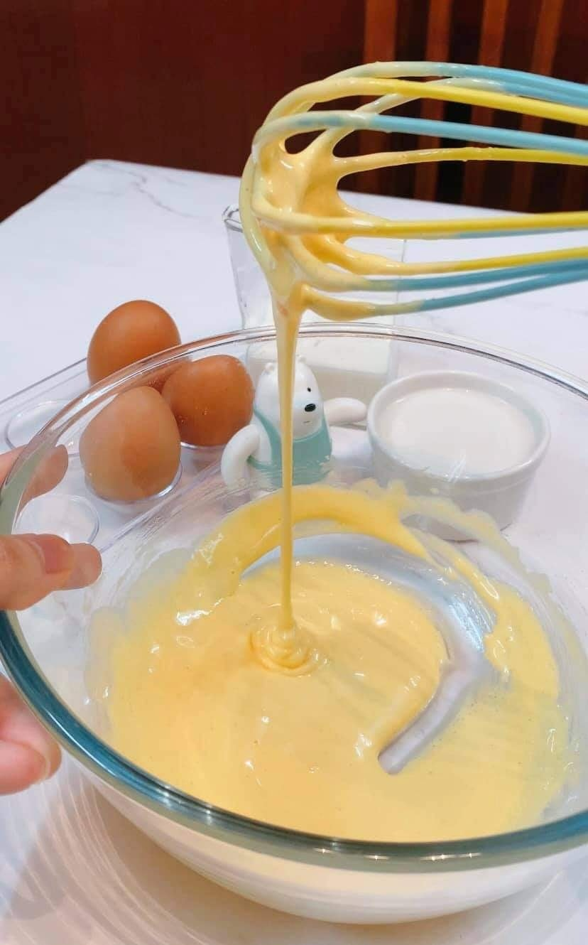 Bước 6: Rây và trộn chung hỗn hợp bột mì, cacao và baking powder. Trứng và đường cho chung vào 1 tô, đánh bông trứng 10 phút đến khi trứng bông, nhạt màu.